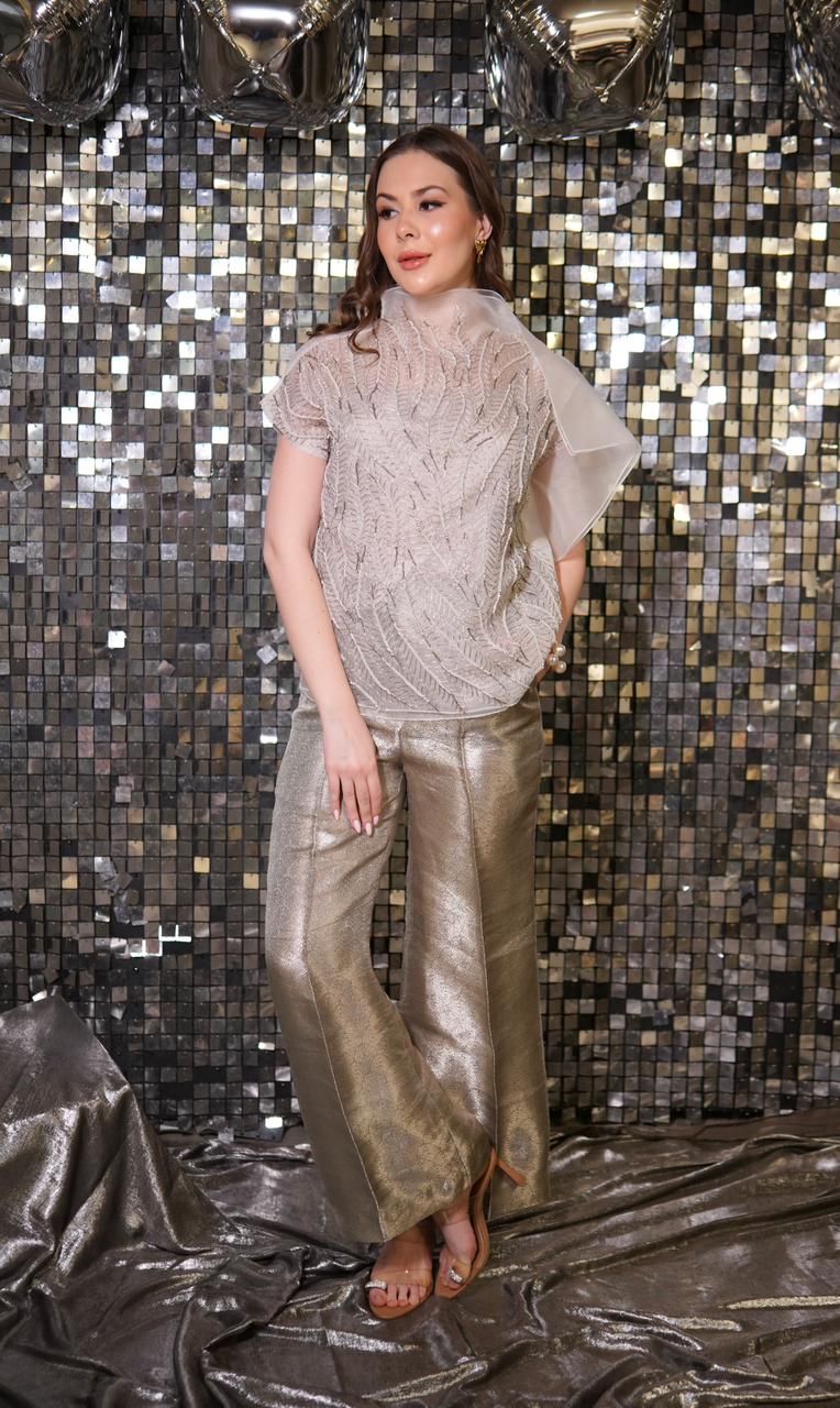 Featuring Work: Brocade tissue straight-fit pants.