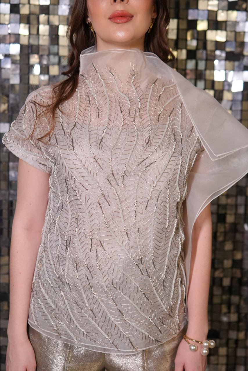 Featuring Work: All-over textured embroidery with a sheer organza drape on one shoulder.