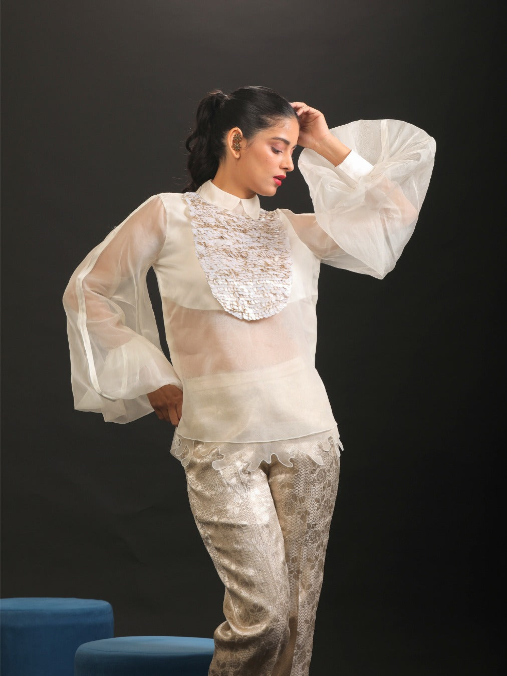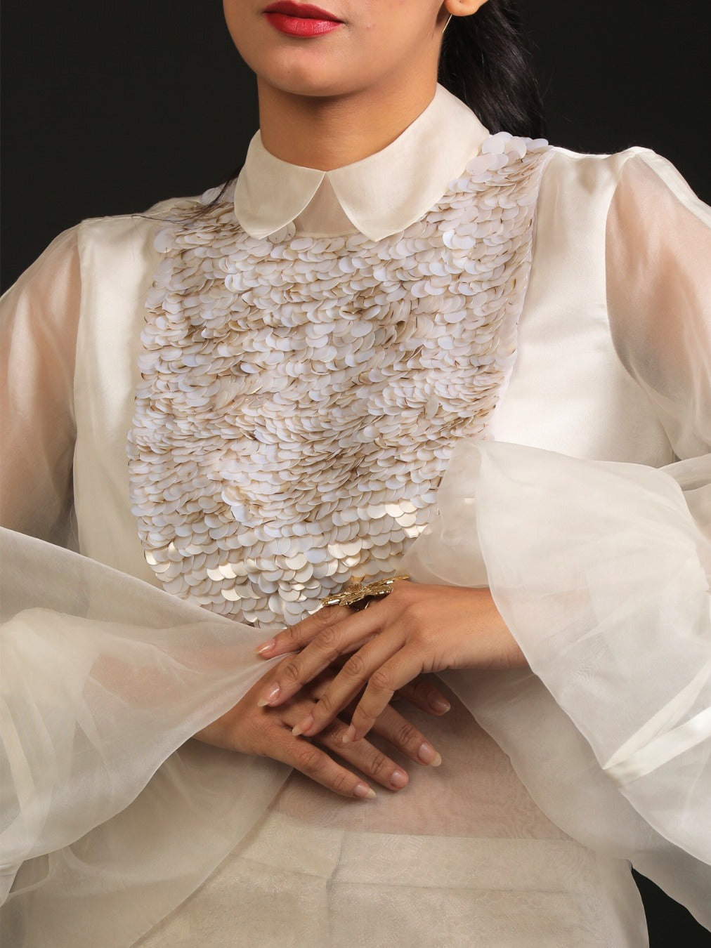 Featuring Work: Collar neckline highlighted with intricate yoke embroidery and statement balloon sleeves