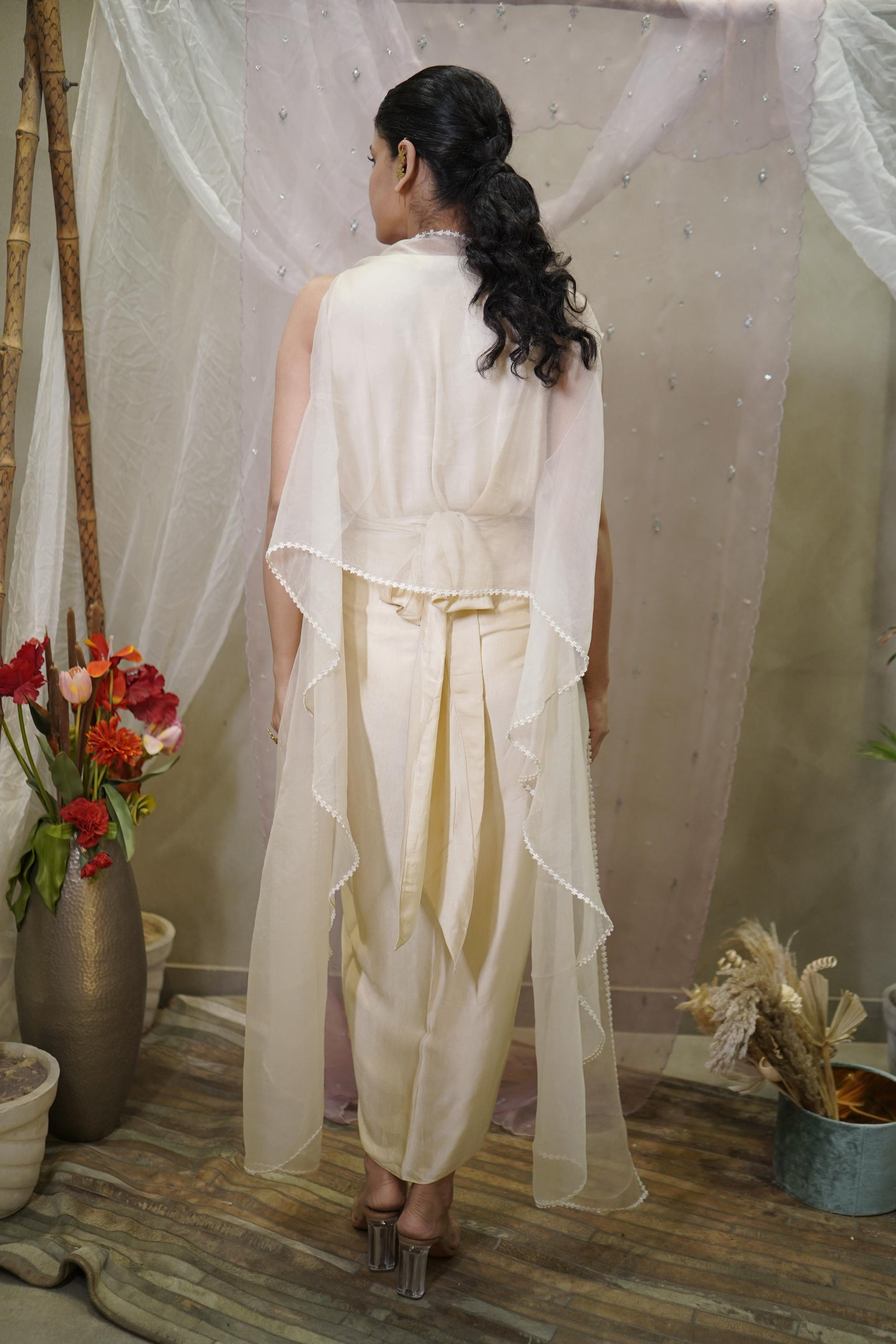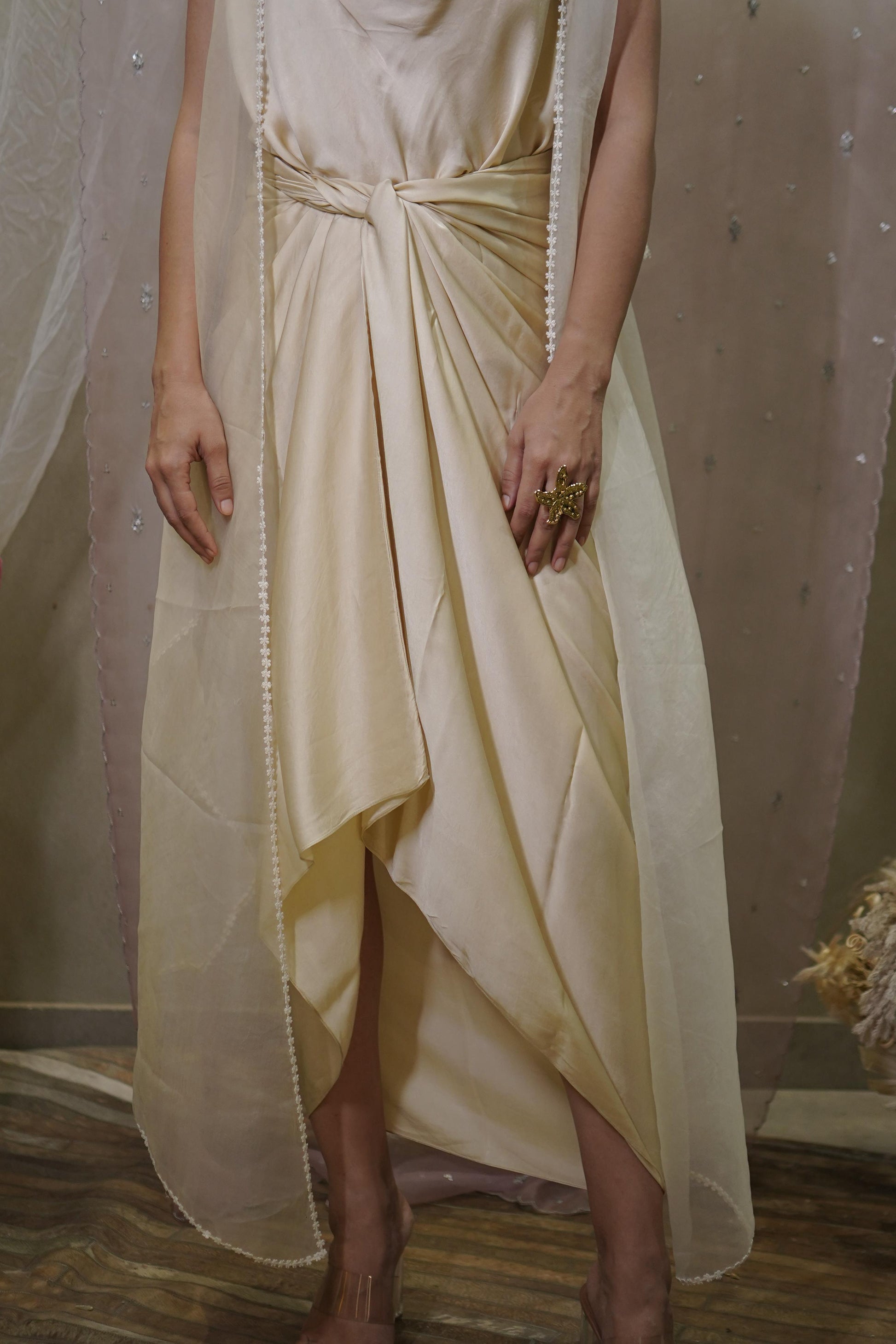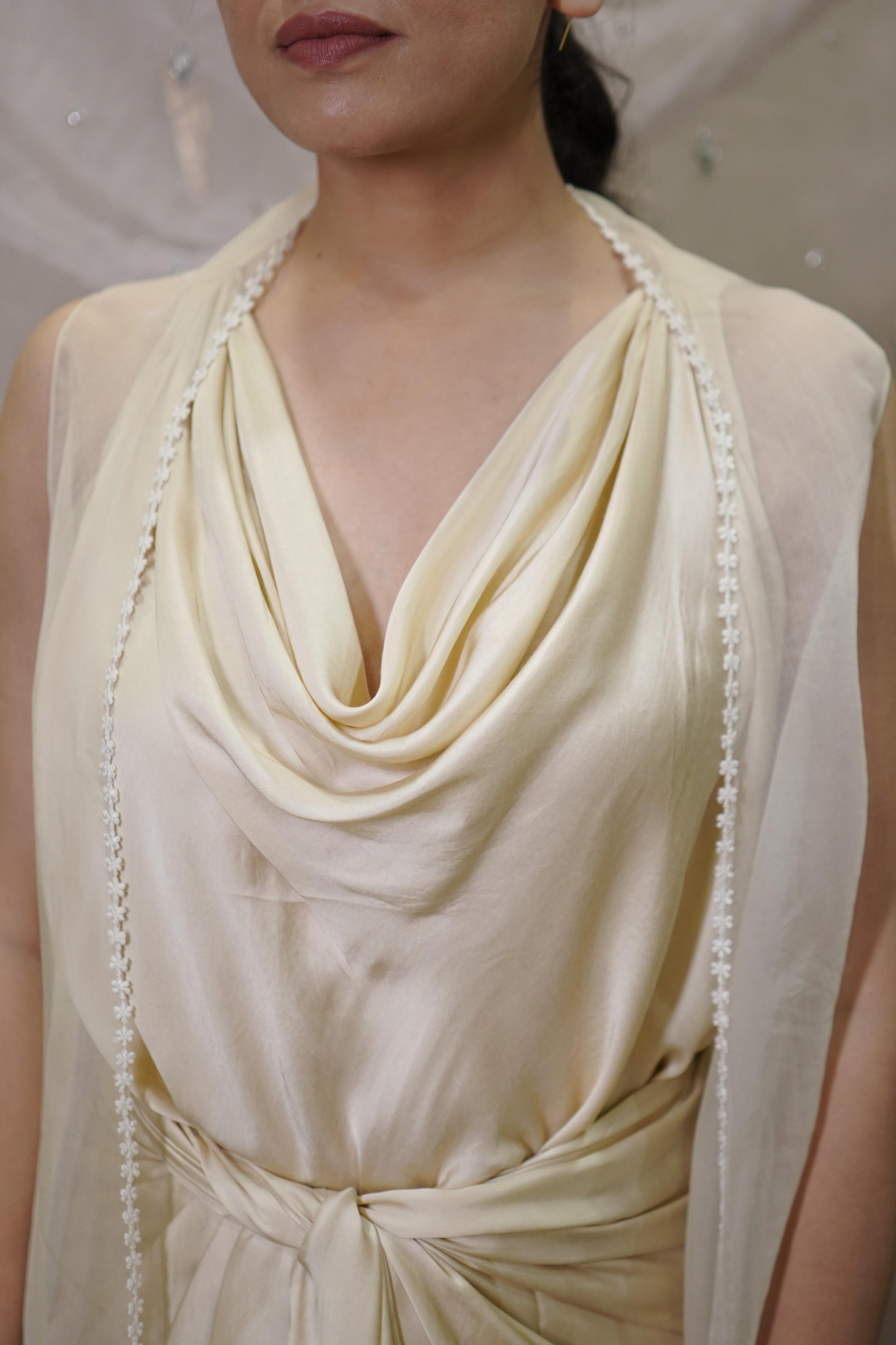 Featuring Work: Cowl-neck top paired with a tie-on draped skirt and an organza shrug featuring white lace detailing on the edges.