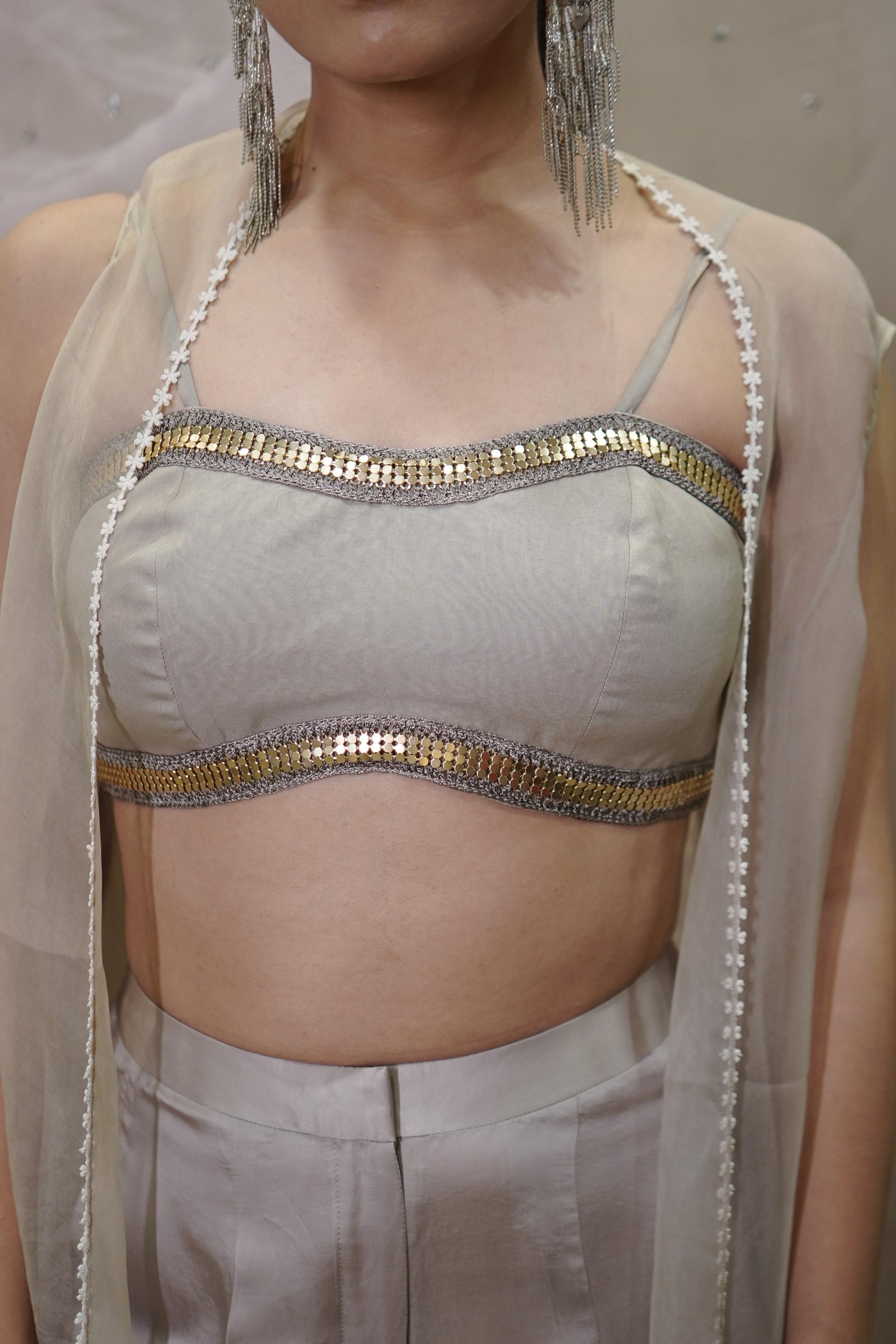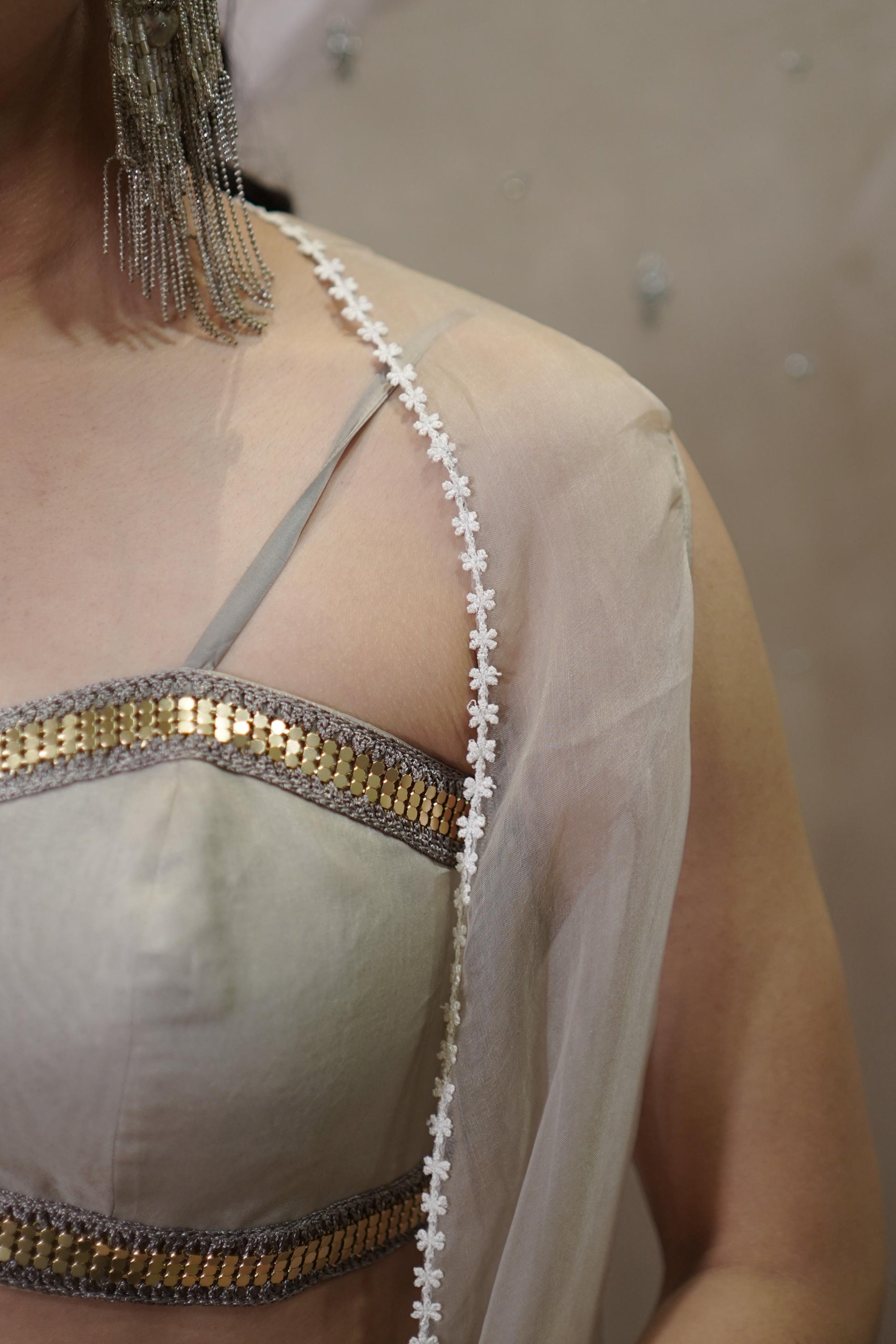 Featuring Work: Organza bustier with gold lace detailing, paired with matching pants and an organza cape featuring white lace detailing on the shrug and pant sides.