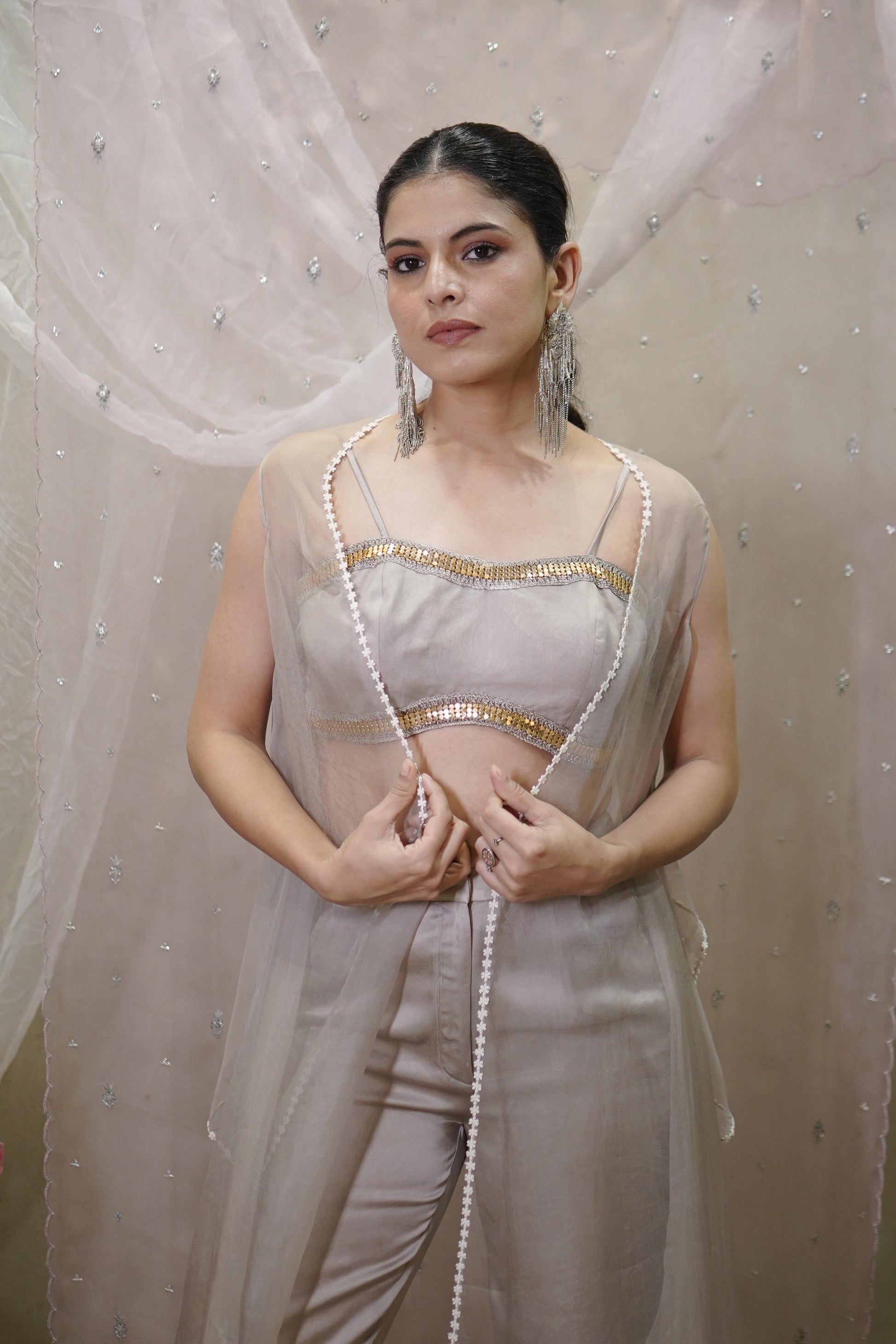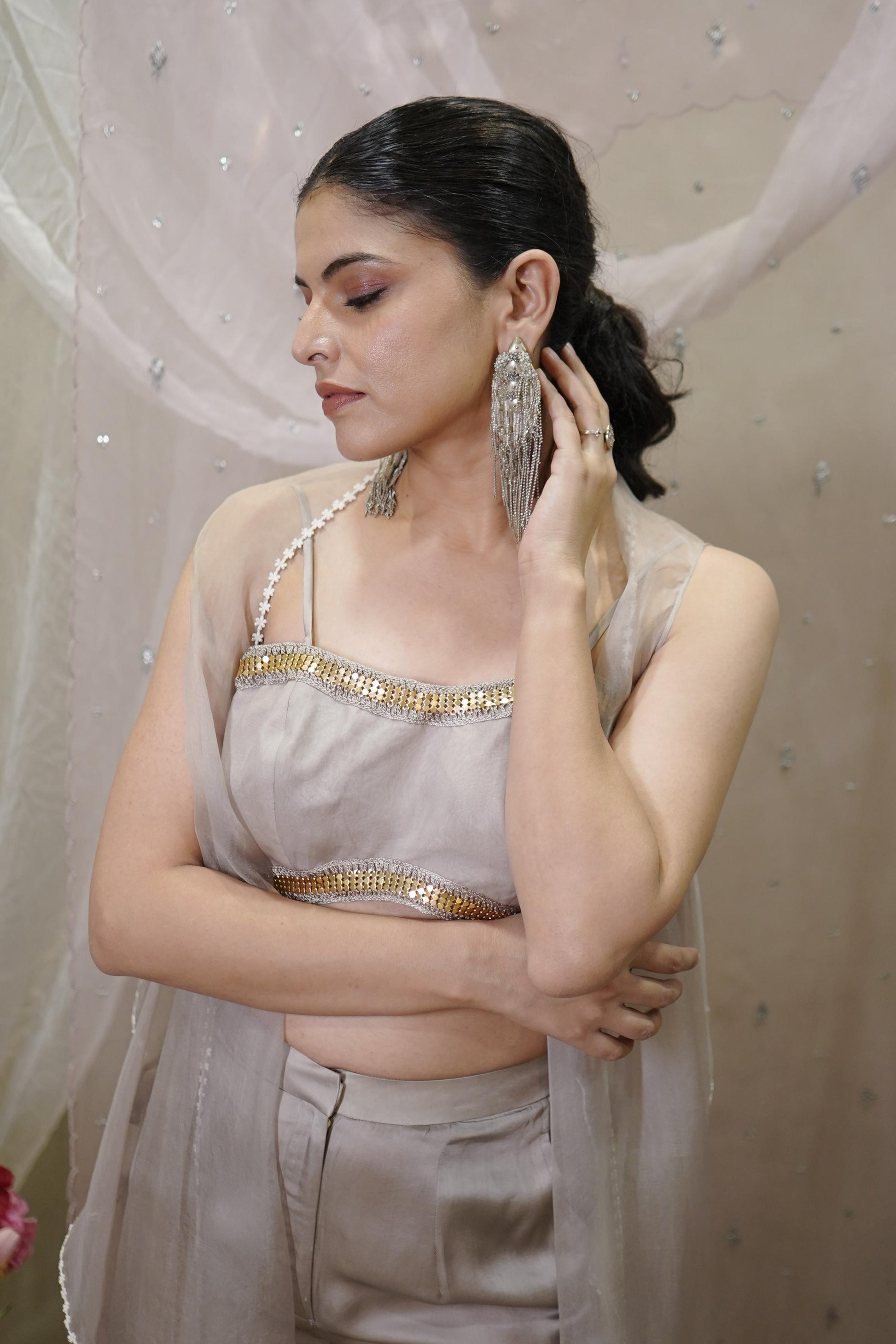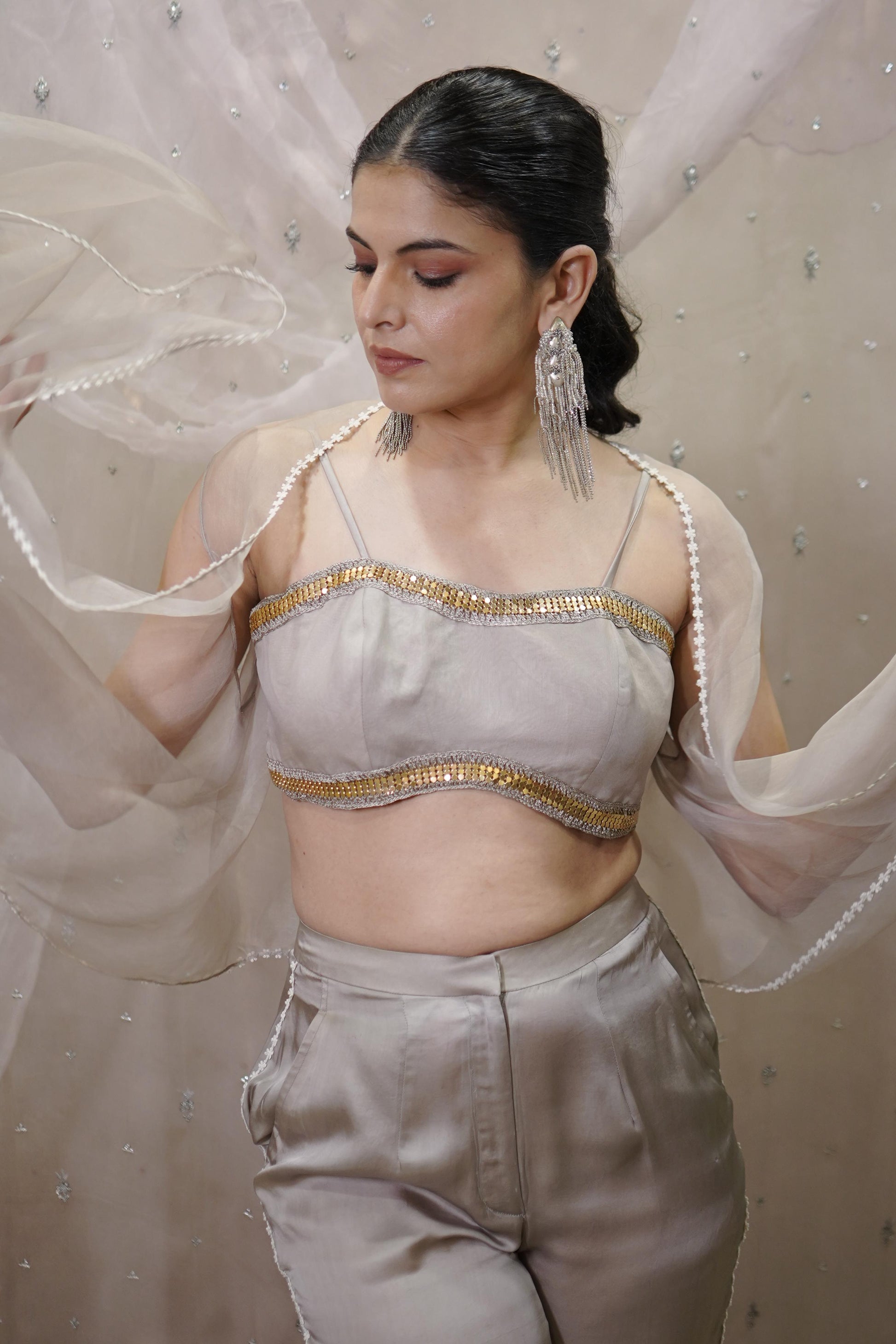 Featuring Work: Organza bustier with gold lace detailing, paired with matching pants and an organza cape featuring white lace detailing on the shrug and pant sides.
