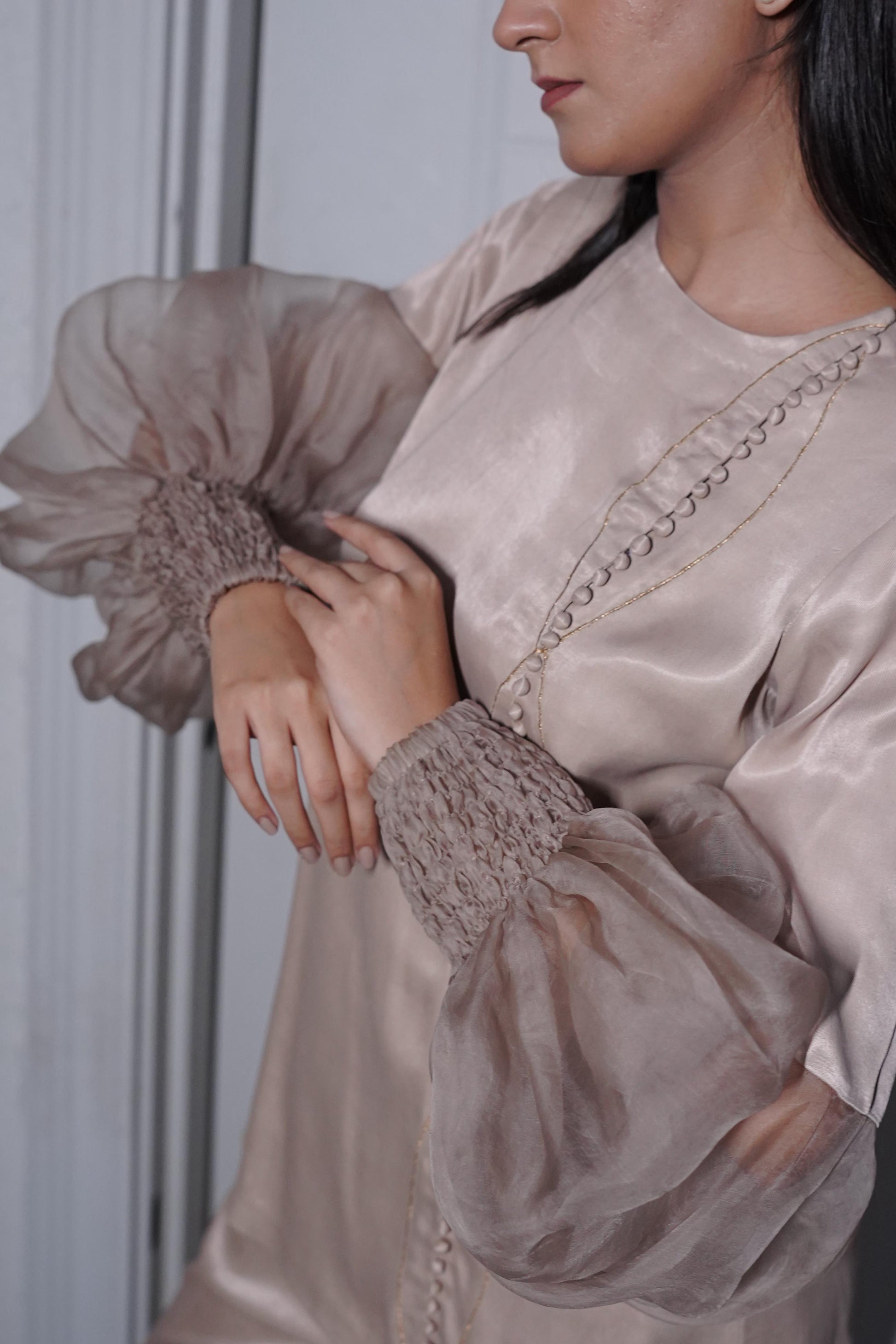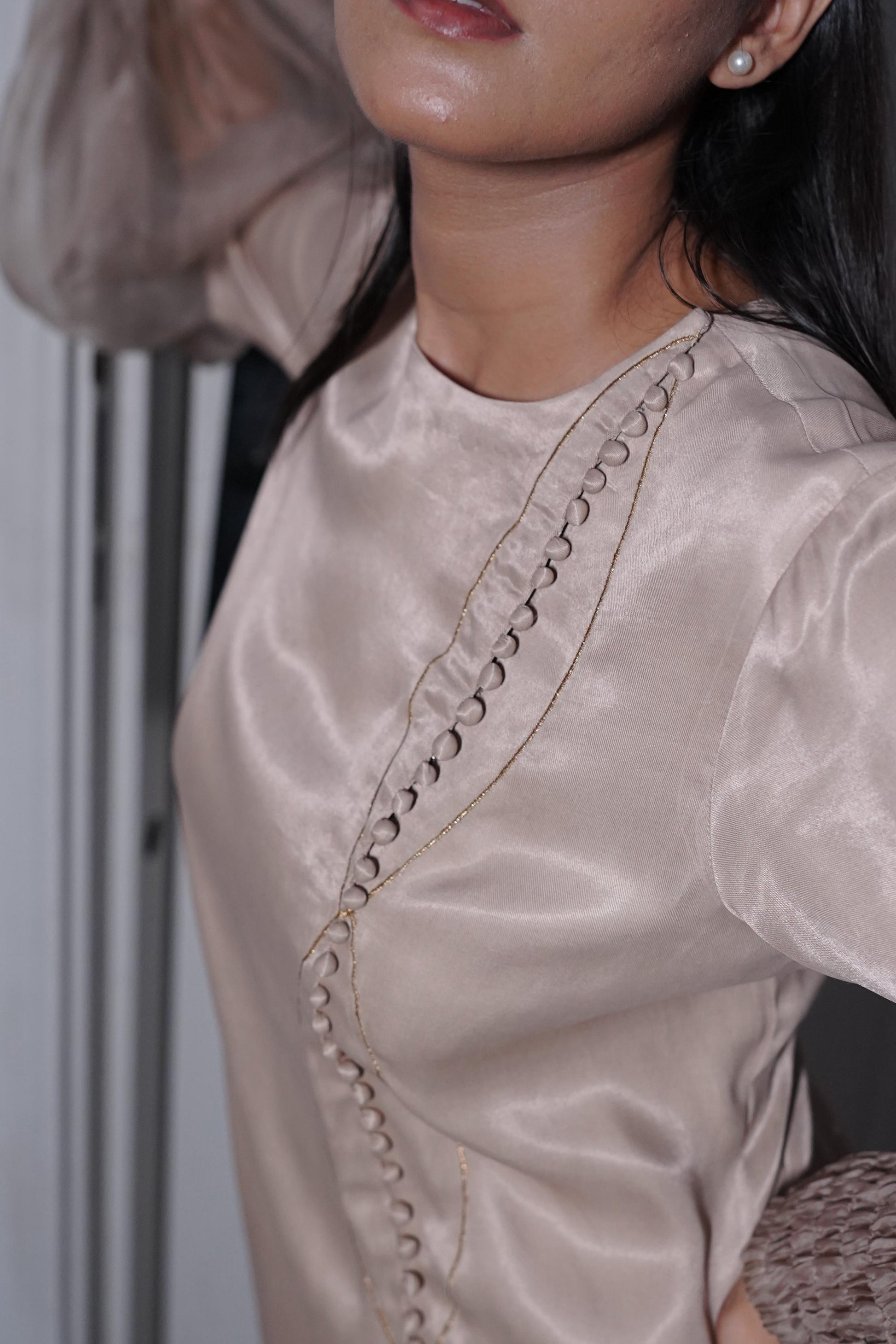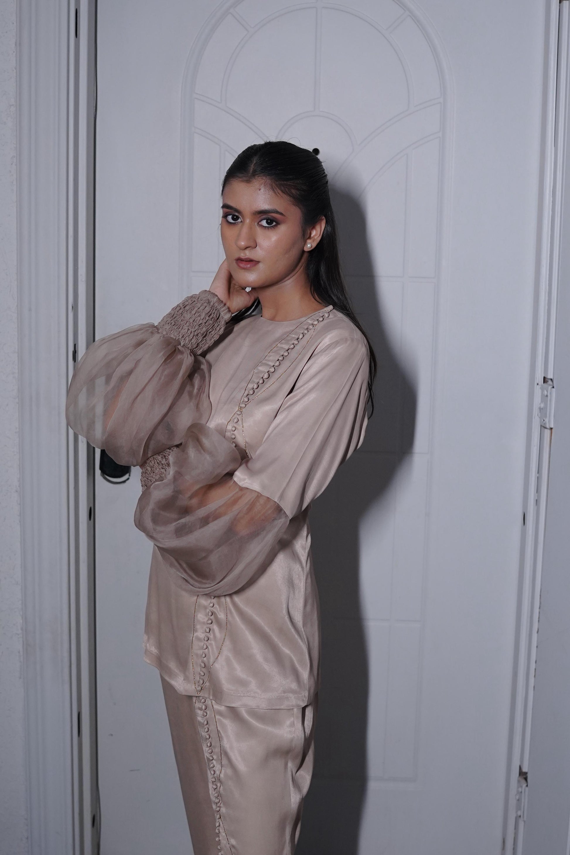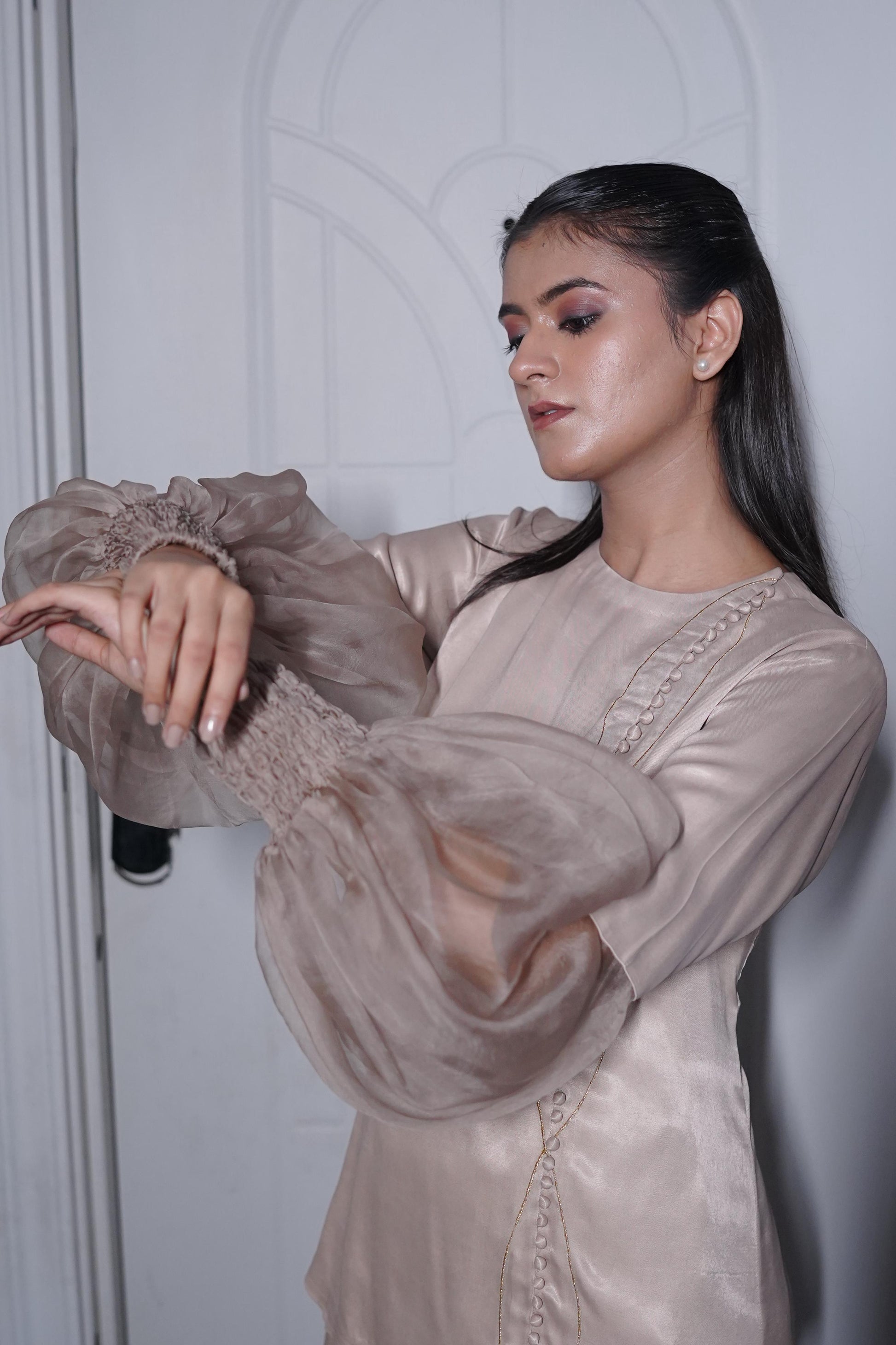 Featuring Work: Beige dull satin top with potli buttons detailing and organza balloon sleeves