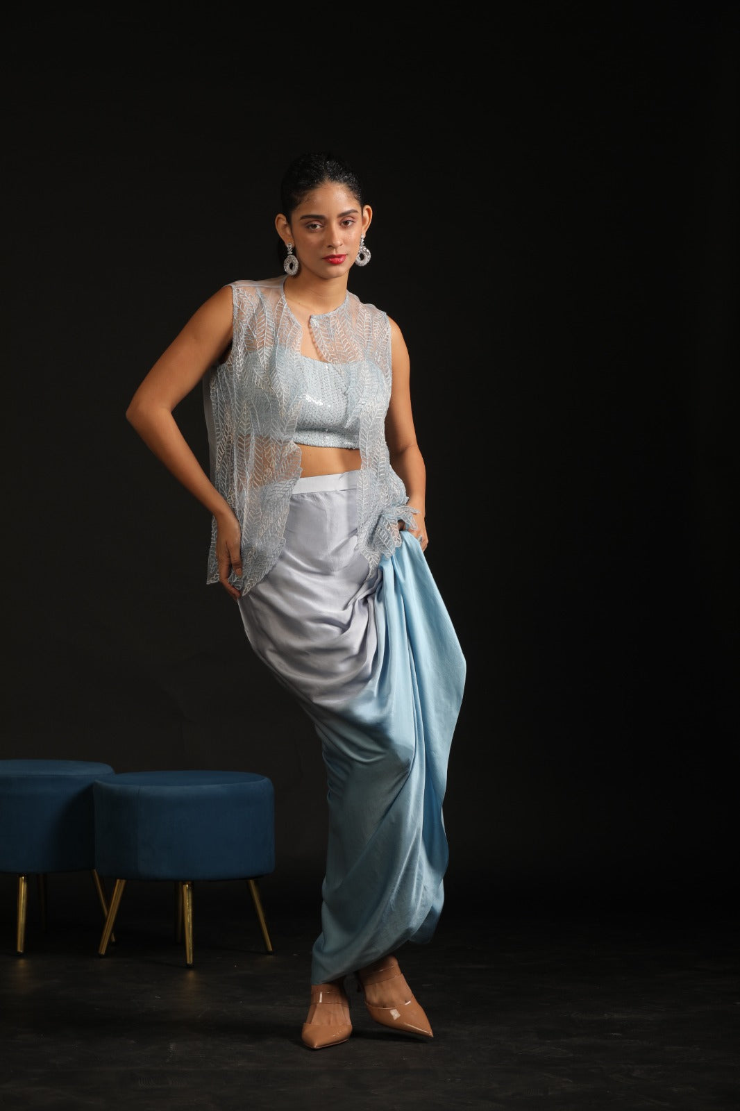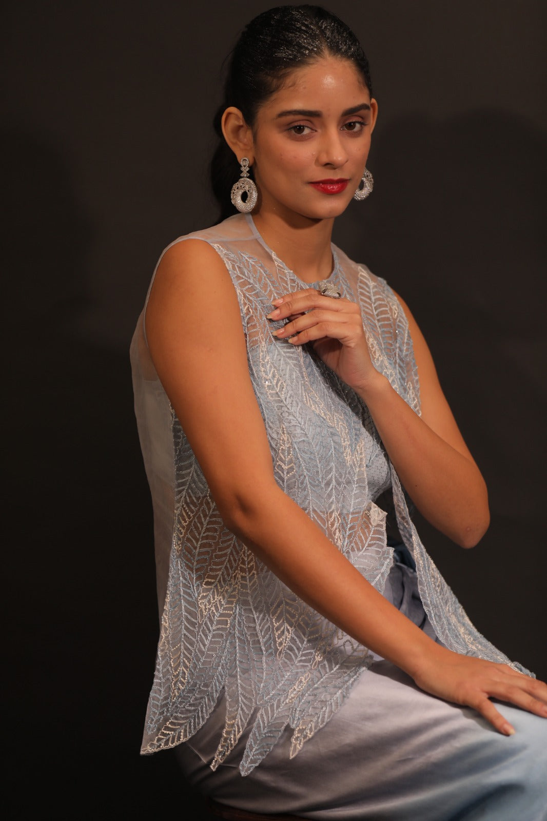 Featuring Work: Sequin-embellished bustier paired with a hand-embroidered leave-style cutwork jacket, designed to add texture, shimmer, and elegance