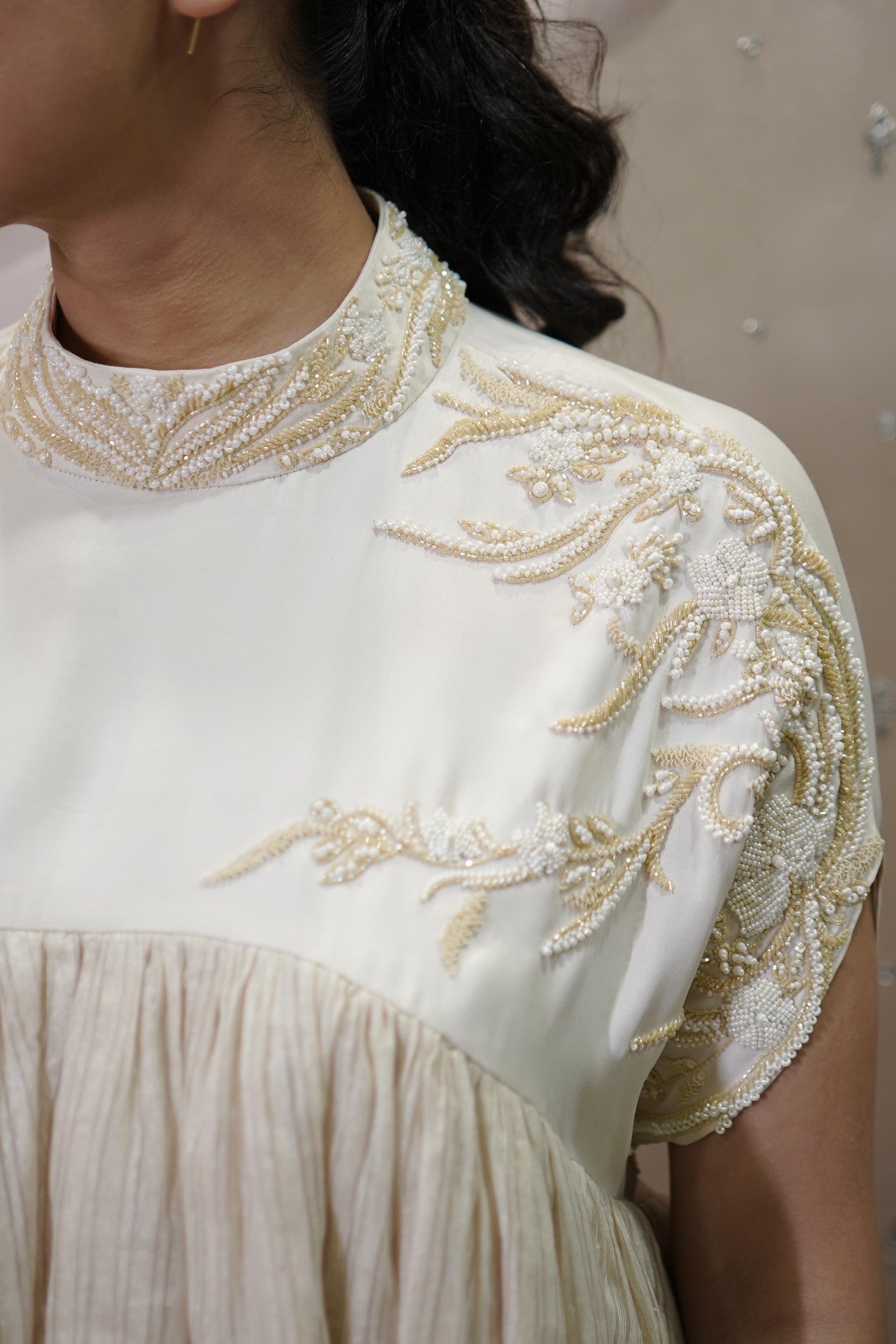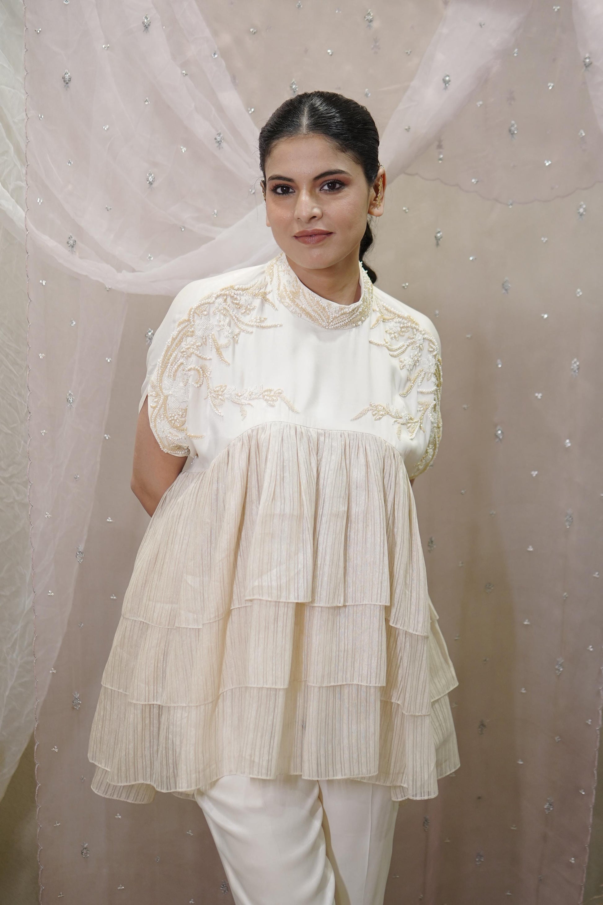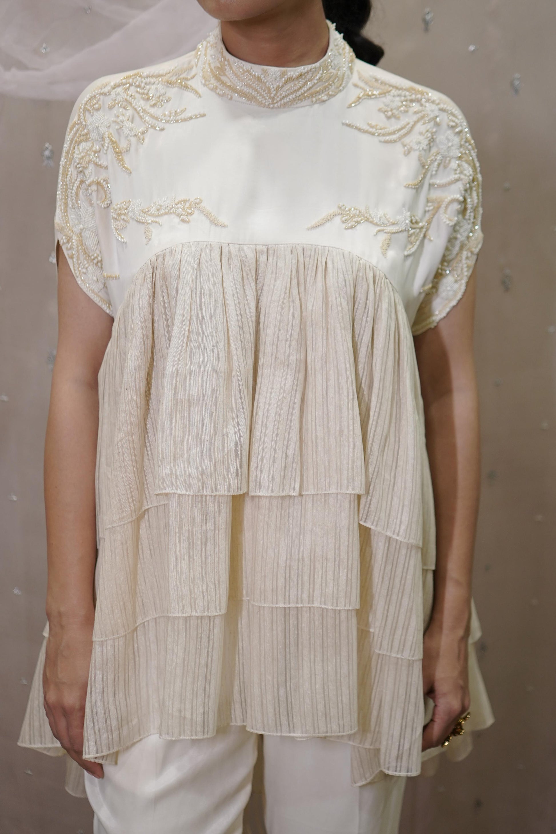 Featuring Work: Layered top featuring gold sequin work on the front.