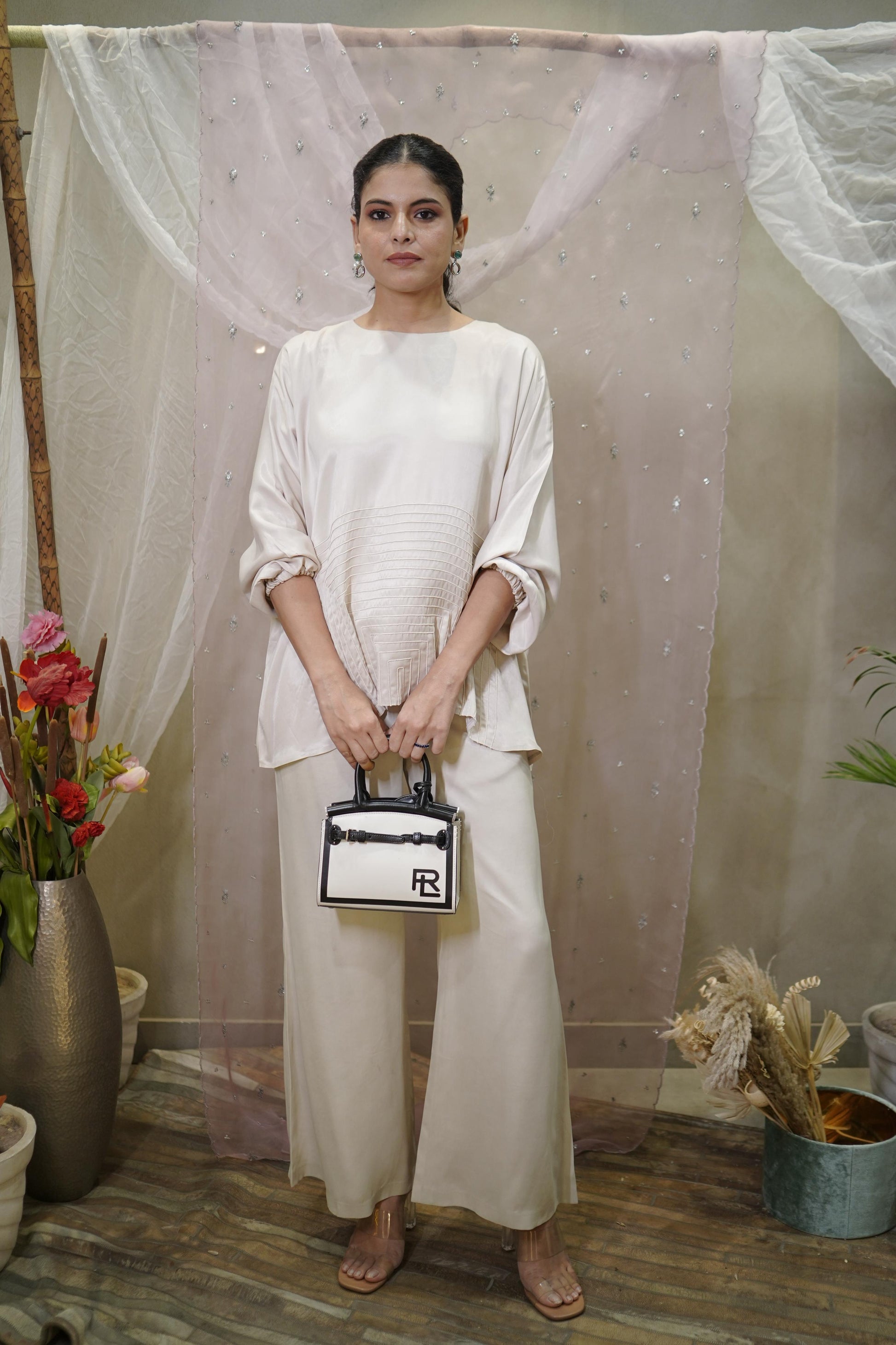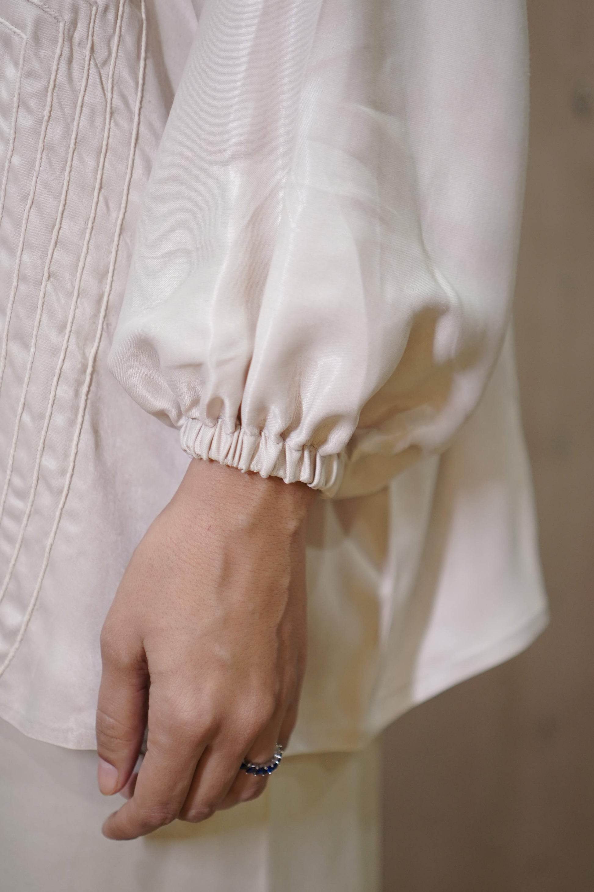 Featuring Work: Grey dull satin top with front and back white dori work, styled with off-shoulder sleeves.