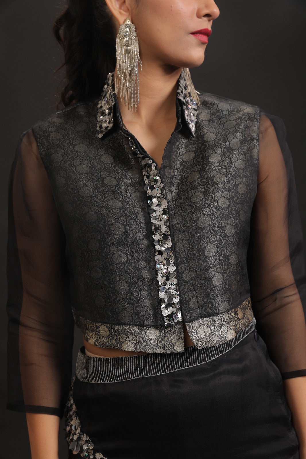 Featuring Work: Front-open crop top crafted in rich brocade tissue, designed with a structured silhouette that adds a refined, statement edge.